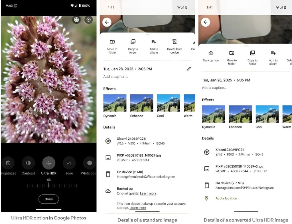 興味深いことに、変換されたウルトラHDR画像は、実際にはオリジナルよりもファイルサイズが小さくなっています。この直感に反する効率は、より小さな「マップを獲得します」輝度情報を保存し、より少ないストレージスペースを消費しながら優れた画質を効果的に提供します。